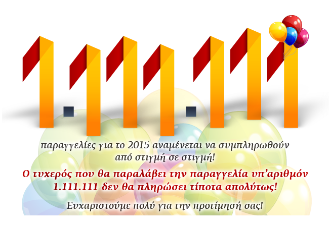 Γι’ αυτό και νικητής φέτος θα είναι αυτός ή αυτή που θα υποβάλει την παραγγελία υπ’ αριθμόν 1.111.111, που φυσικά δεν θα πληρώσει τίποτα! Η παραγγελία με αριθμό 1.111.111 για το 2015 θα συσκευαστεί στις κεντρικές εγκαταστάσεις του e-shop.gr στο Μενίδι και θα παραδοθεί εντελώς δωρεάν στον τυχερό της αποδέκτη! Το όνομα του τυχερού ή της τυχερής θα ανακοινωθεί στη σελίδα μας στο Facebook!